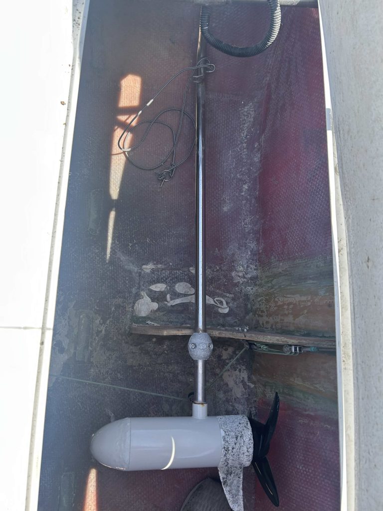 Currently uses 12 volt inverter connected to bilge pump with float switch for bailing. Will need to add new battery if boat moored out or left unattended. Manual bilge pump included.